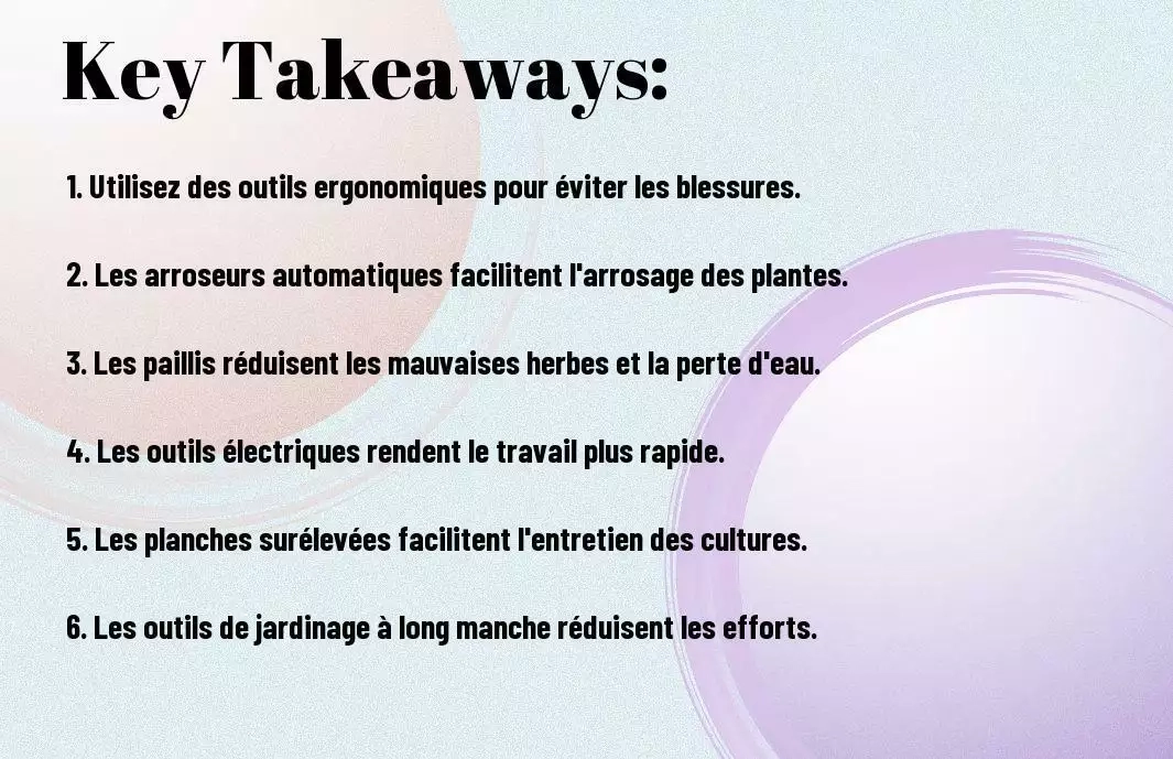 En investissant dans ces outils pratiques, vous pourrez profiter d'un potager florissant avec moins d'efforts physiques. Prenez le temps de bien vous équiper et d'apprendre à utiliser ces outils correctement pour optimiser les résultats et prendre plaisir à jardiner sans contraintes. Votre potager vous remerciera en vous offrant des récoltes abondantes et saines tout au long de l'année.